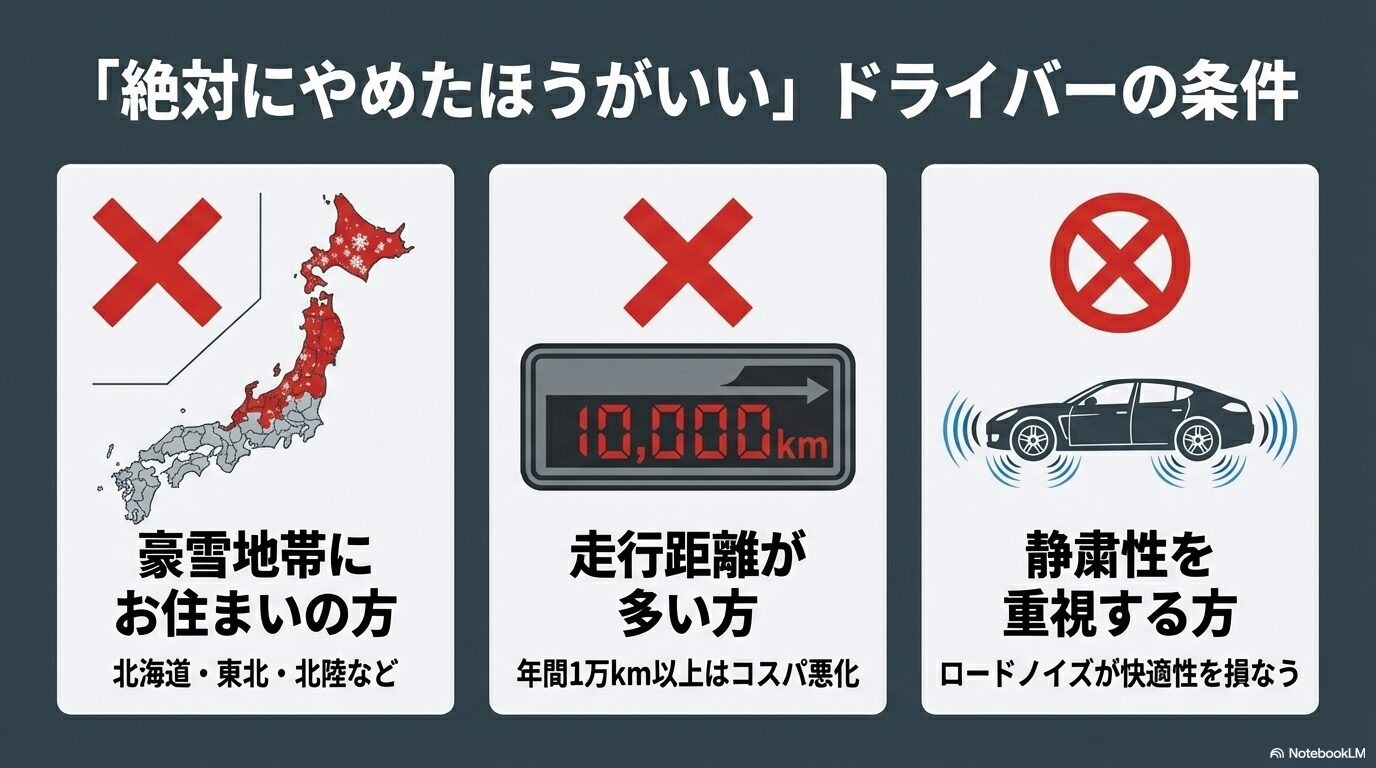 ここまでのデメリットを踏まえて、オールシーズンタイヤの装着を見送った方がいい、つまり「買ったら後悔する可能性が高い人」の特徴を具体的に整理していきます。