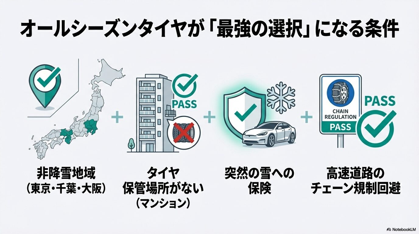 デメリットばかりをお伝えしてきましたが、もちろんオールシーズンタイヤがピタッとハマる人もいます。