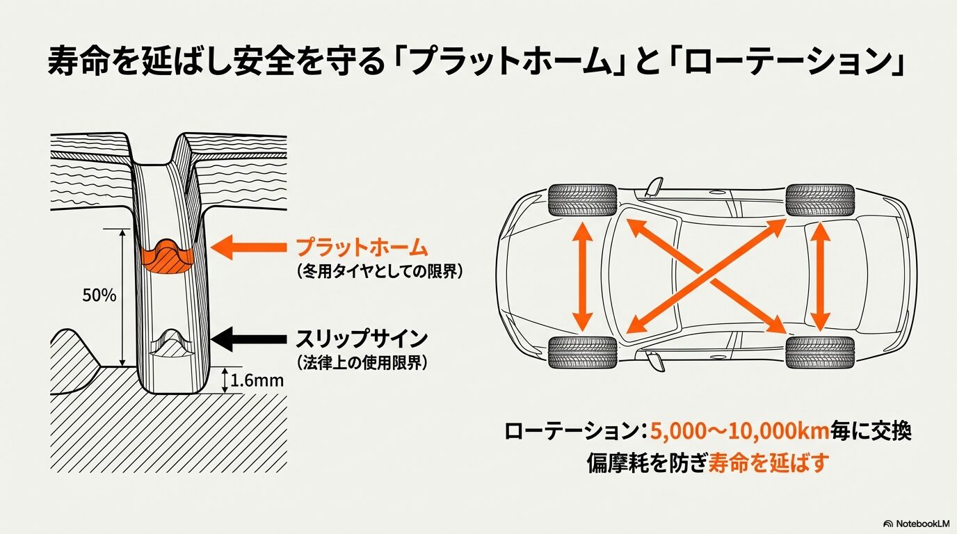 | プラットホーム | 溝が新品の50%で露出。 冬用タイヤとしての限界。 | これが出た時点で雪道走行は不可。 冬前に露出寸前なら買い替えを検討。 |