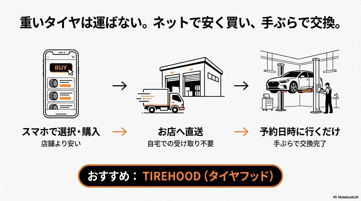 タイヤフッド最大の魅力は、ネット通販ならではのタイヤ本体の安さと、実店舗での取り付けの手軽さを両立している点です。