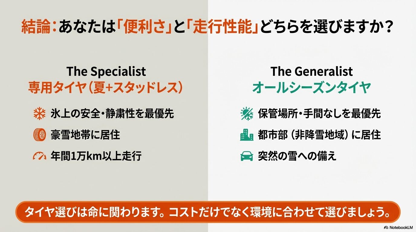 - オールシーズンタイヤが持つ構造的な弱点とリスク