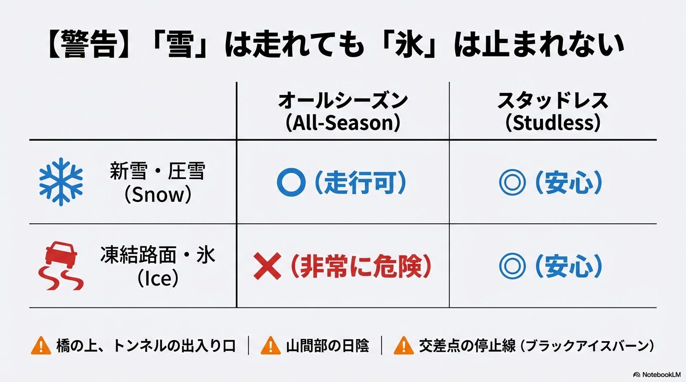 「オールシーズン」という名前から、どんな気象条件でも万能に走れると勘違いしてしまうことが一番の落とし穴です。