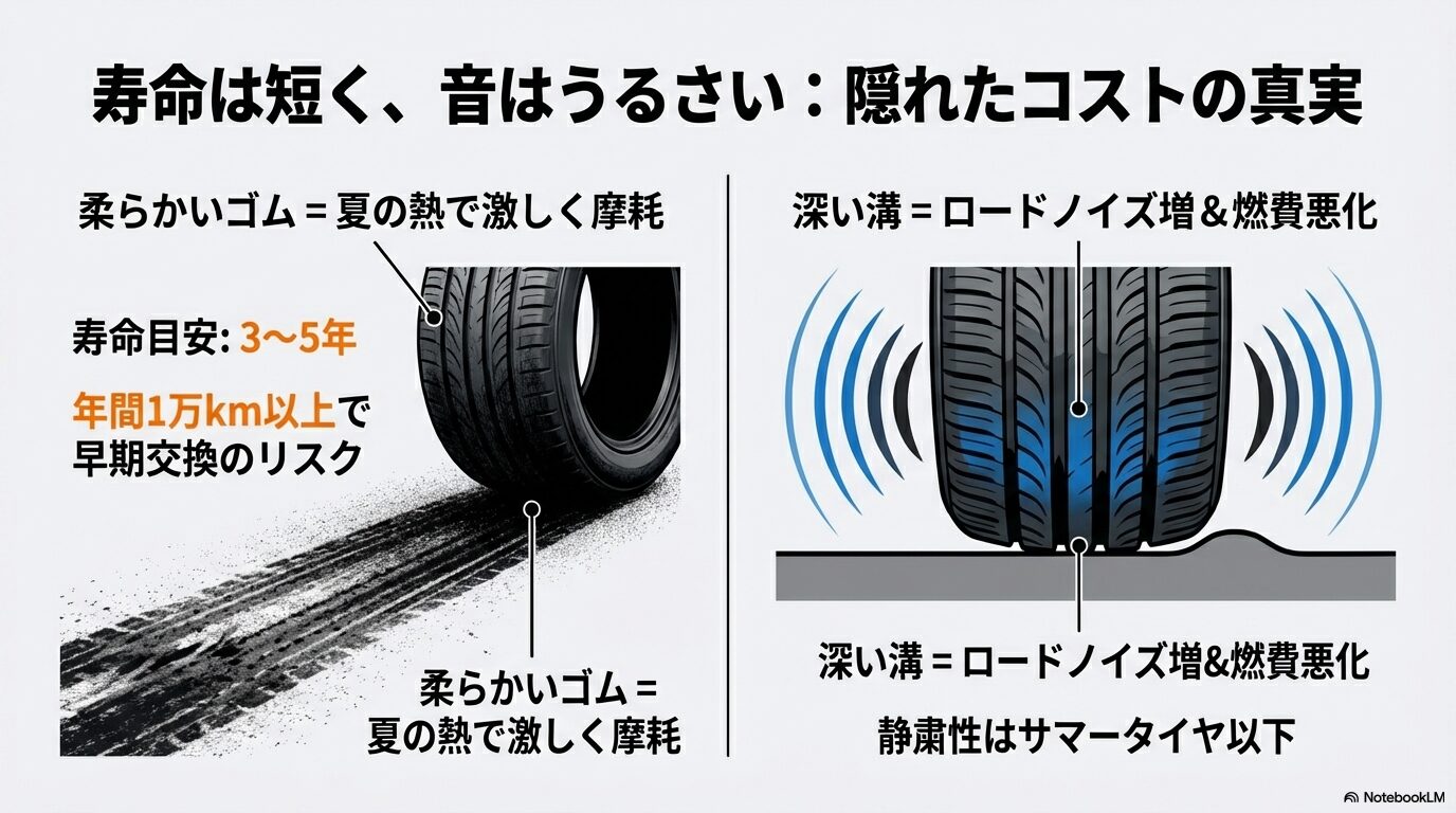 タイヤの交換頻度が上がり、結果的にランニングコストが跳ね上がるため、一年中履きっぱなしにできる経済的なメリットが全く得られなくなります。