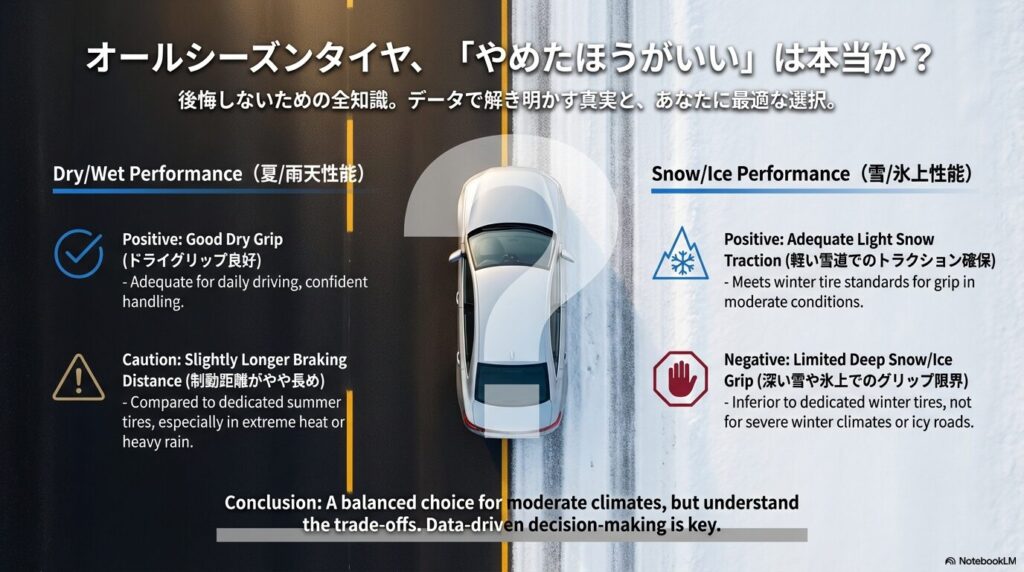 結論から言うと、「オールシーズンタイヤはやめたほうがいい」という意見が出る最大の理由は、「冬用タイヤとしての性能に対する過度な期待」と「実際の限界性能」のギャップにあります。