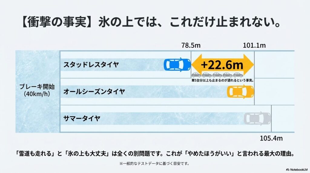 特に、氷の上でのブレーキ性能に関しては、知らなかったでは済まされない大きなリスクが潜んでいます。