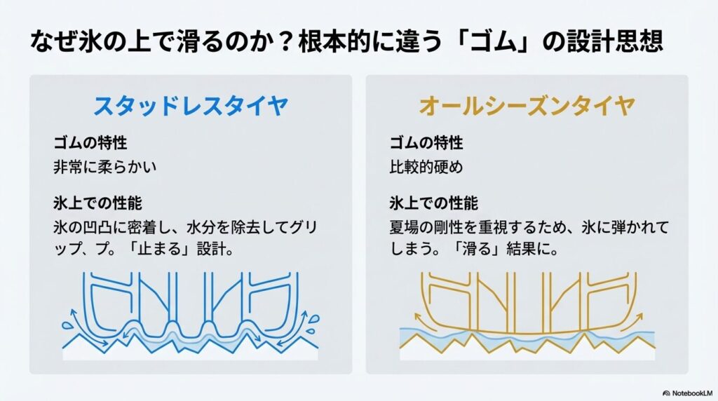 | オールシーズン | 比較的硬め (夏場の剛性重視) | 滑る (氷に弾かれる) |
