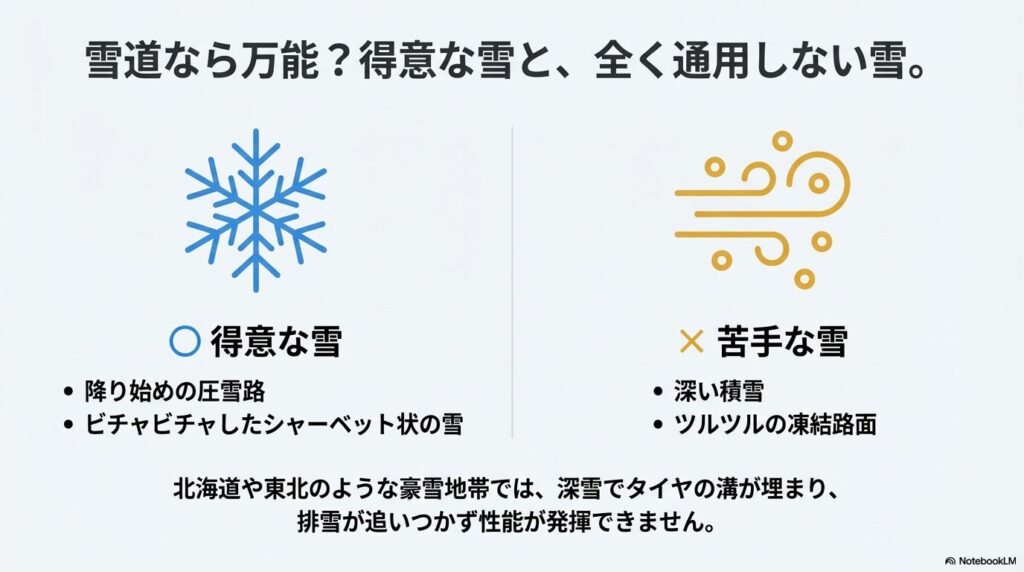 しかし、北海道や東北のような豪雪地帯で、タイヤの溝が埋まるほどの深雪になると、排雪が追いつかず「ただのゴムの塊(スリックタイヤ状態)」になってしまいます。