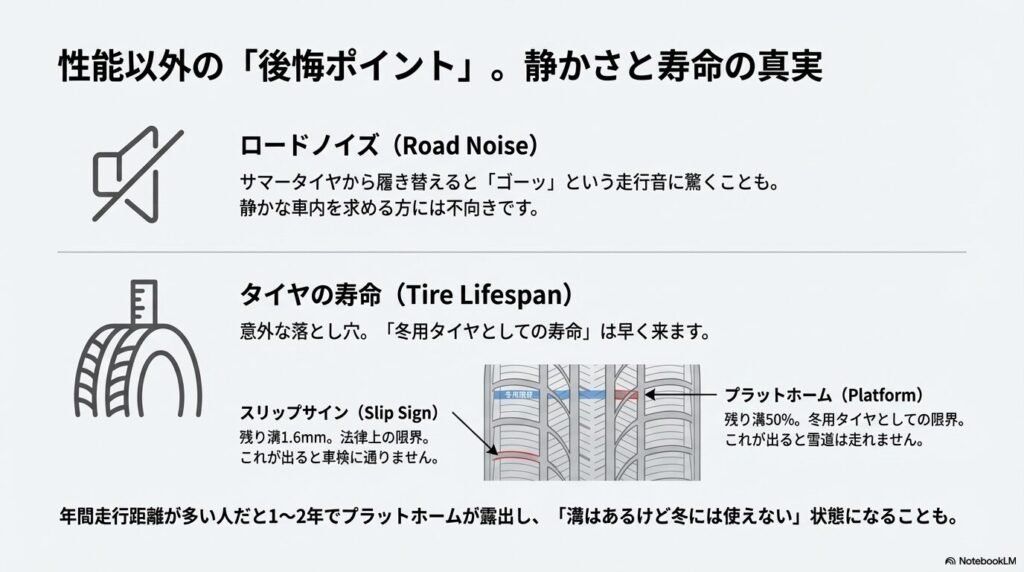 年間走行距離が多い人(月1,000km以上など)だと、1〜2年で「プラットホーム」が露出してしまい、「溝はあるけど冬には使えない」という中途半端な状態になってしまうことがあるのです。