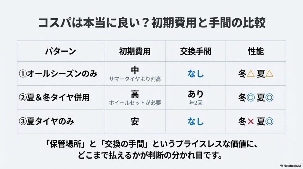 オールシーズンタイヤの導入コストを、他の選択肢と比較してみましょう。