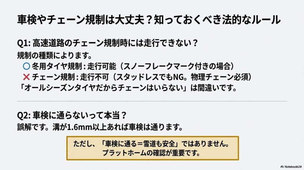 「オールシーズンタイヤだと車検に通らないって本当?」「チェーン規制が出たらどうするの?」といった、法的な疑問についても○×形式でクリアにしておきましょう。
