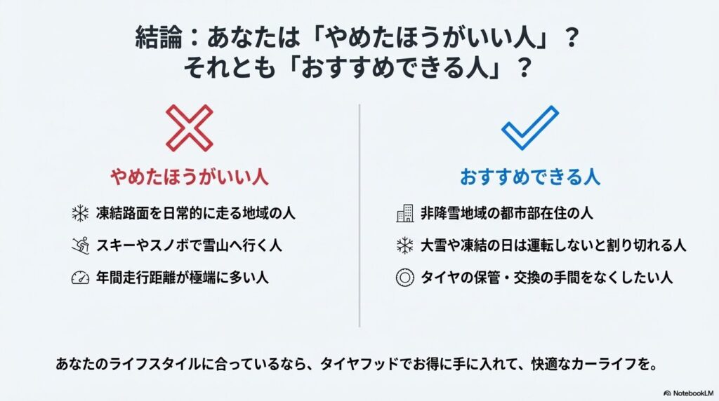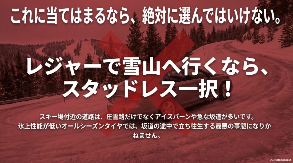 この条件なら、アイスバーンのリスクを避けつつ、「急な雪でも帰ってこられる安心感」と「タイヤ交換の手間なし」というメリットを最大限に享受できます。