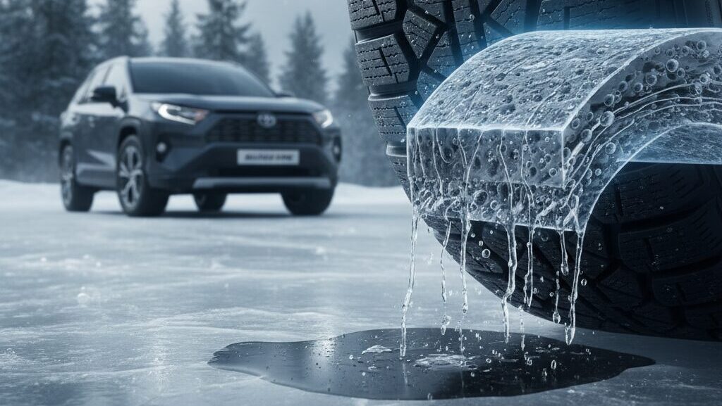 スタッドレスが氷で滑る最大の原因は、氷そのものじゃなくて、タイヤの熱や圧力で氷が溶けてできる「水膜」なんです。スケートリンクと同じ状態ですね。