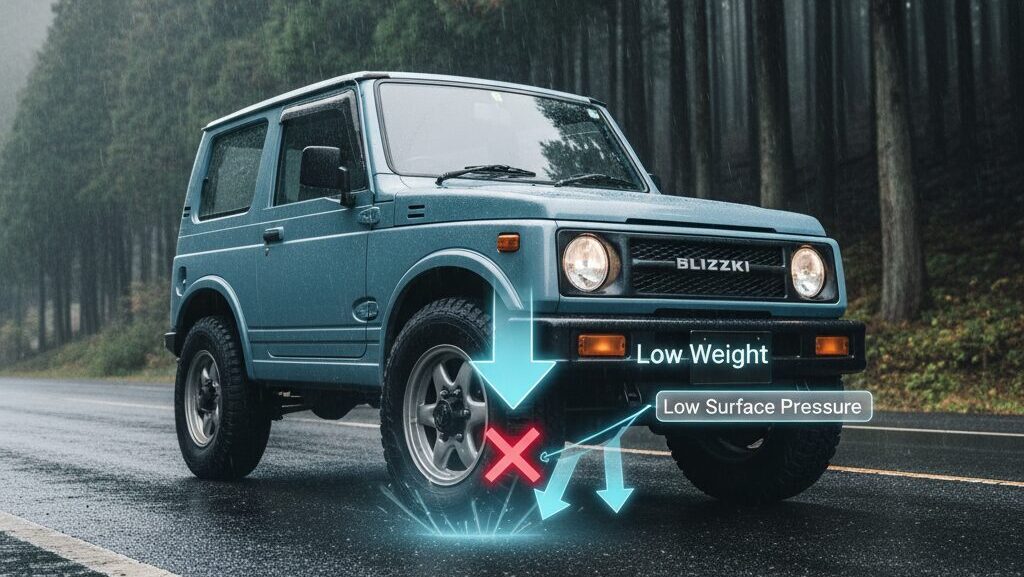 そのため、パジェロミニのような軽量な車種のオーナーさんにとっては、その高剛性設計が逆に「滑る」という感覚につながる可能性はゼロではない、ということです。