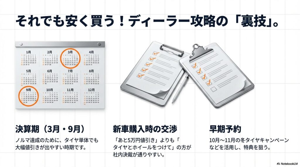 なぜディーラーのタイヤ交換は高いのか、その理由を知ることで、納得感も変わってくるし、交渉の糸口も見えてきます。