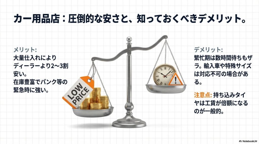 カー用品店のデメリットは、繁忙期(雪が降る予報が出た直後など)の混雑です。予約なしで行くと3時間待ち、なんてこともザラにあります。