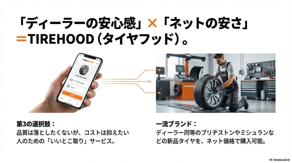 「タイヤフッド」なら、ディーラー品質のタイヤをネット価格で購入し、手ぶらで交換に行ける。