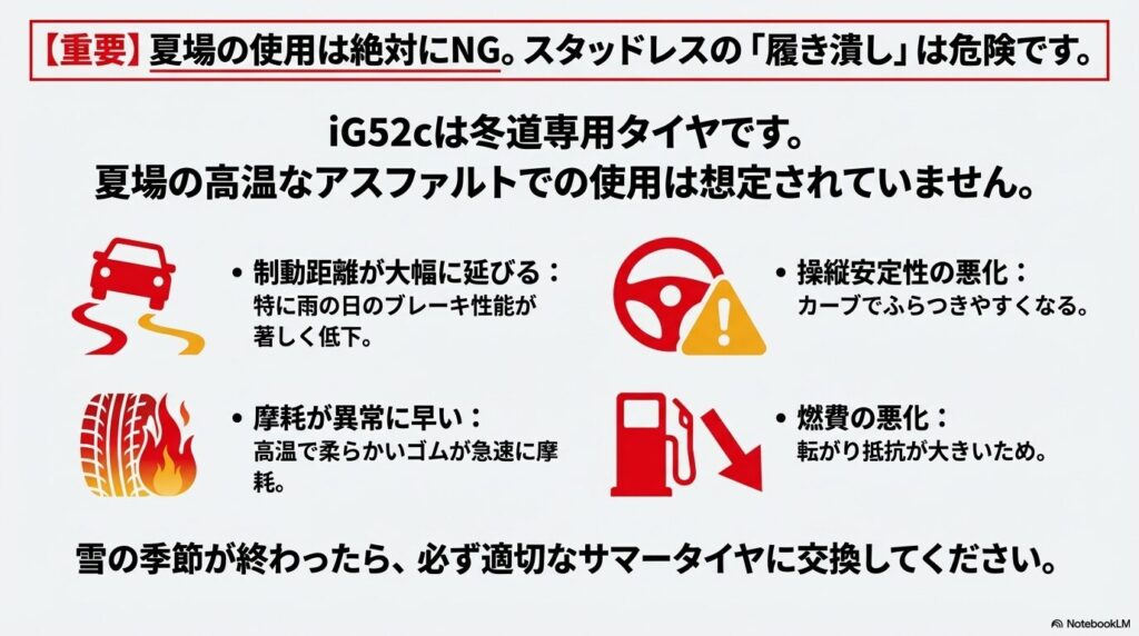 iG52cは冬道専用のタイヤであり、夏場の高温なアスファルトでの使用は一切想定されていません。