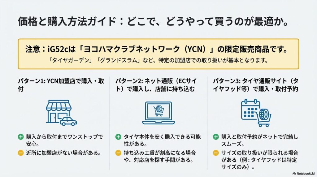 - 店頭での購入は「タイヤガーデン」など、ヨコハマクラブネットワーク(YCN)加盟店限定という点に注意が必要です。