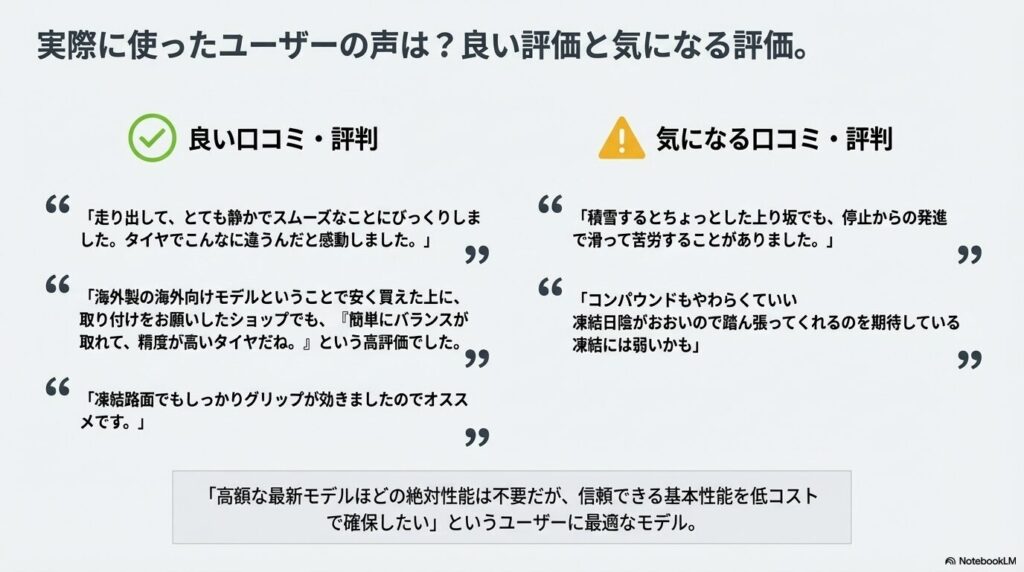 実際のユーザーによる口コミ・評判はもちろん、基本的な雪道性能、コストパフォーマンス、さらには耐久性(劣化は早いか、長持ちするか)まで、気になるポイントを網羅的に解説します。