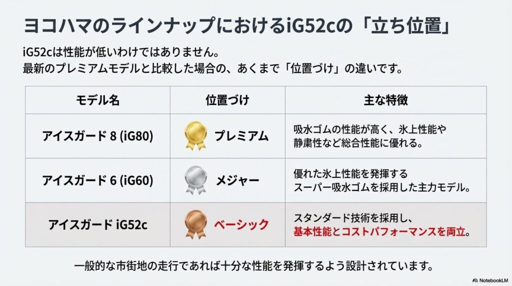 iG52cはあくまでベーシックモデルであることを理解し、ご自身の走行環境で最も重視する性能(コストか、絶対的な氷上性能か)を明確にして選ぶことが大切です。
