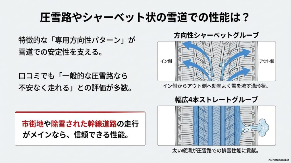 実際の口コミでも「一般的な圧雪路なら不安なく走れる」といった評価が見られます。