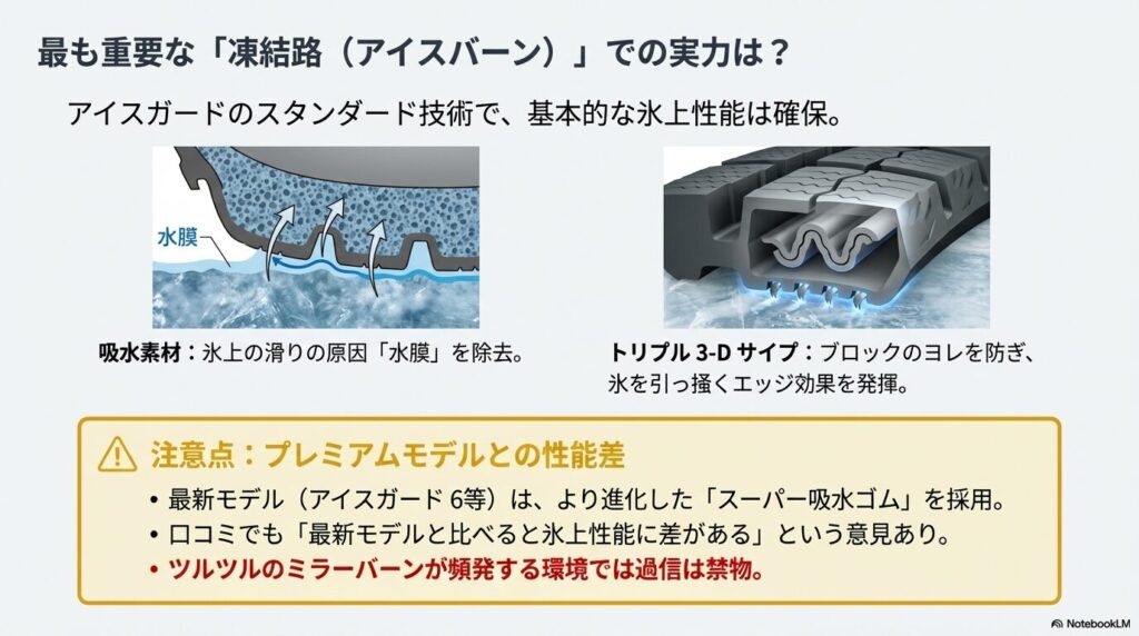 | 郊外・峠道メイン ・ミラーバーンが頻発する路地 ・凍結しやすい橋の上や峠道 | △ 注意が必要 (プレミアムモデル推奨) | より高い氷上性能と安全マージンが求められます。 このような環境では、氷上性能に特化したプレミアムモデル(iG6,7,8等)を選ぶ方が賢明です。 |