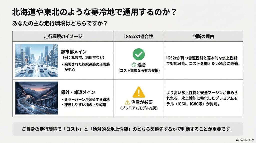 | 都市部メイン (例:札幌市や旭川市など) ・除雪された幹線道路の圧雪路が中心 | ◎ 適合 (コスト重視なら有力候補) | iG52cが持つ雪道性能と基本的な氷上性能で対応できる可能性が高いです。 コストを抑えたい場合に適しています。 |