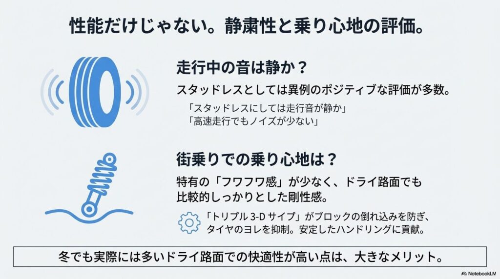 冬道の性能だけでなく、毎日乗る上での快適性もタイヤ選びの重要なポイントです。