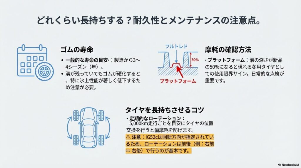 ベーシックモデルであるiG52cの寿命や摩耗性能はどの程度なのでしょうか。また、スタッドレスタイヤ特有の使用上の注意点についても解説します。