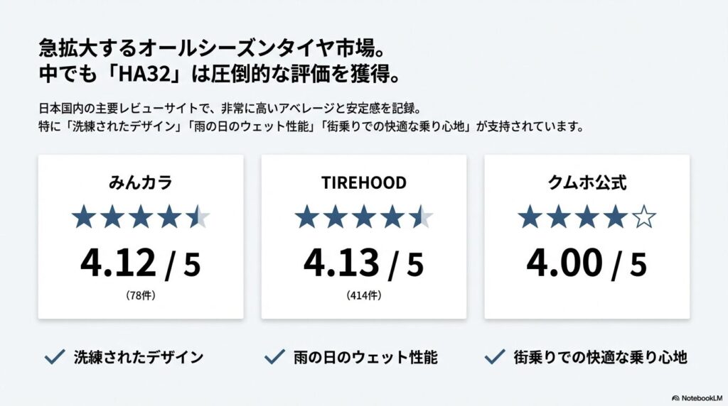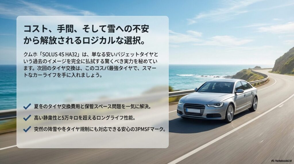 クムホの「SOLUS 4S HA32」は、単なる安いバジェットタイヤという過去のイメージを完全に払拭する、驚くべき実力を秘めたオールシーズンタイヤです。