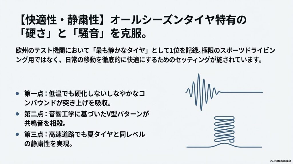 オールシーズンタイヤ特有の硬さを心配するユーザーも多いですが、HA32に採用されている最新のコンパウンドは、低温でも硬化しないしなやかさを持っています。