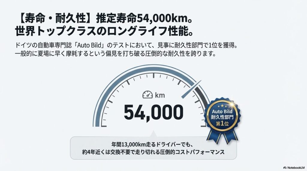 自分のように年間1万3000キロ走るドライバーでも、約4年近くは交換不要で走り切れる計算になり、圧倒的なコストパフォーマンスを誇ります。