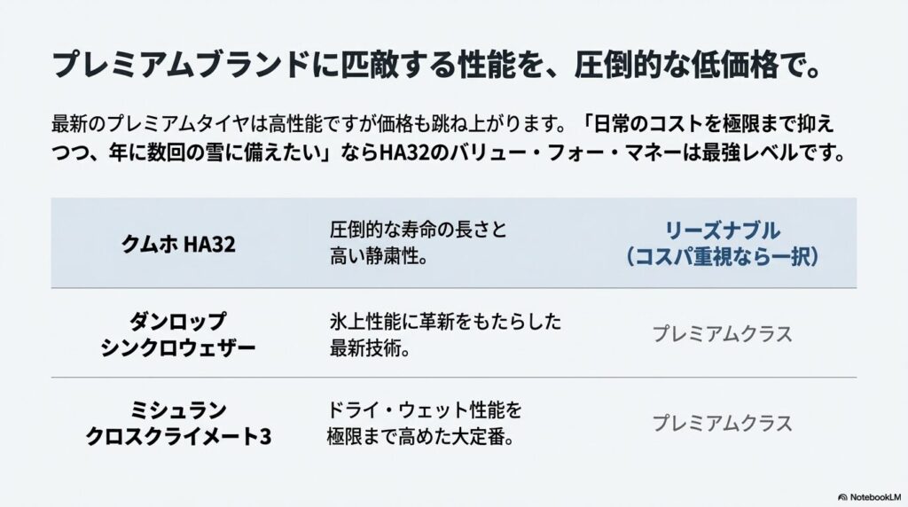 クムホ公式からも「積雪路線・凍結路での走行はお控えください」と警告が出ています。雪への備えを目的とするなら、必ずHA32を選択してください。