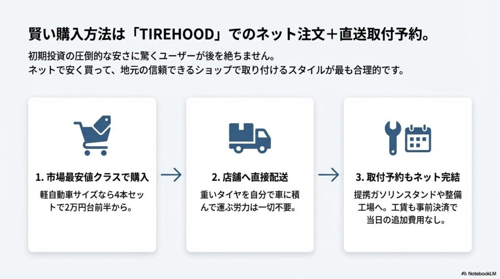 現在は持ち込み交換を歓迎する店舗も増えているため、ネットで安く買って地元の信頼できるショップで取り付けるスタイルが最も合理的です。
