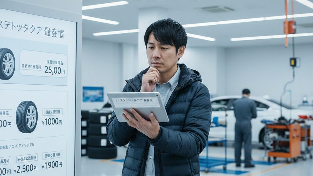 - 同じタイヤでも、どこで取り付けるかによって総額が数千円単位で変わる。