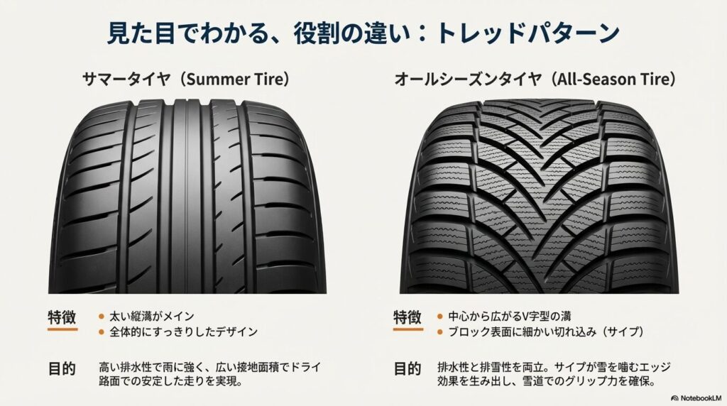 サマータイヤ(ノーマルタイヤ)とオールシーズンタイヤが、そもそも「モノ」としてどう違うのかを見ていきましょう。