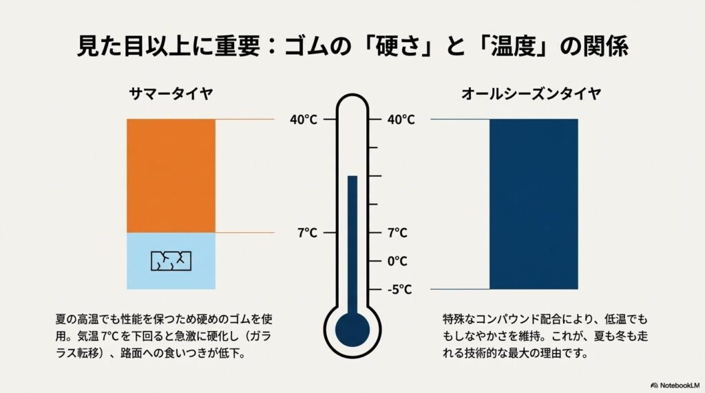 見た目以上に重要なのが、ゴムの素材(コンパウンド)の違いです。ここには「温度」に対する科学的なアプローチの差があります。