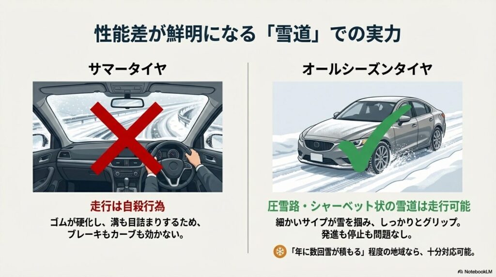 「サマータイヤとオールシーズンタイヤの違い」が決定的に現れるのが雪道です。