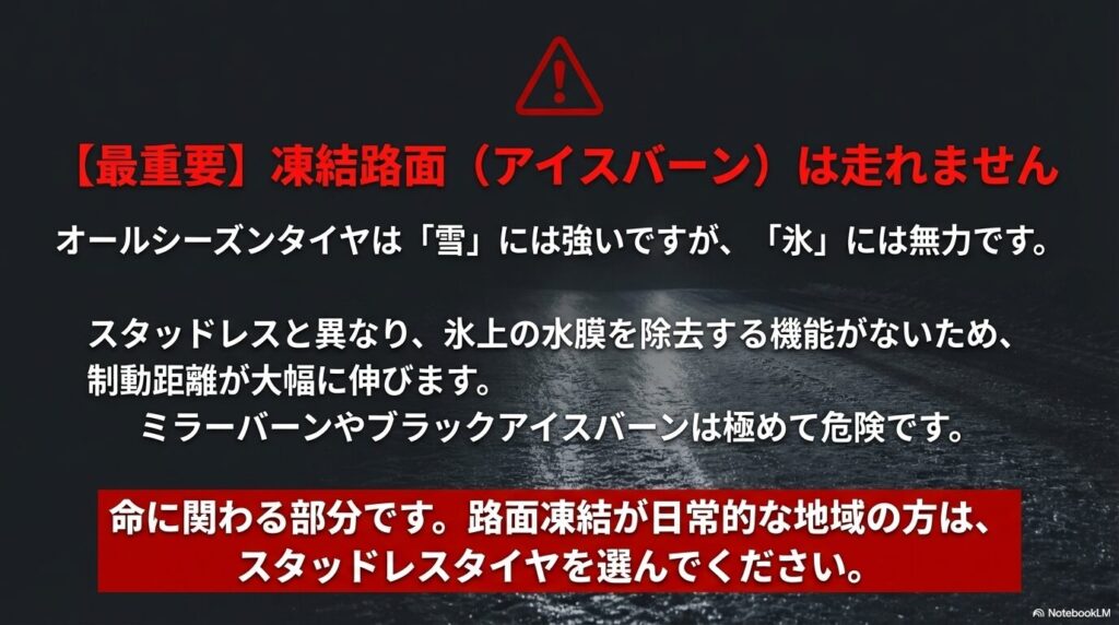 北海道や東北、あるいは山間部など、「路面凍結が日常茶飯事」という地域にお住まいの方には、正直なところオールシーズンタイヤ一本での運用はおすすめできません。