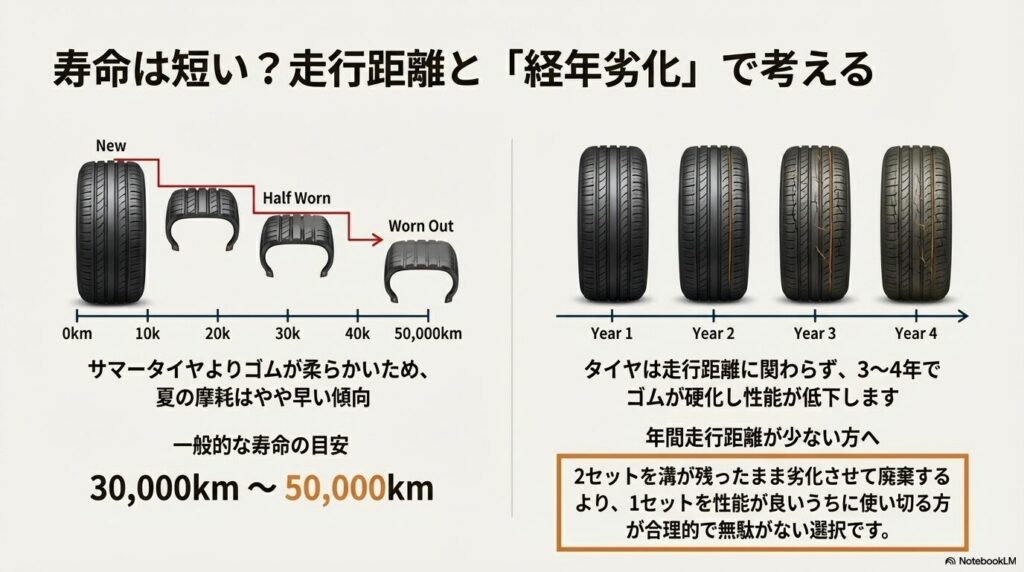 年間走行距離が少ない方の場合、サマータイヤとスタッドレスを2セット持っても、溝が残ったままゴムが劣化して廃棄になるケースが非常に多いんです。