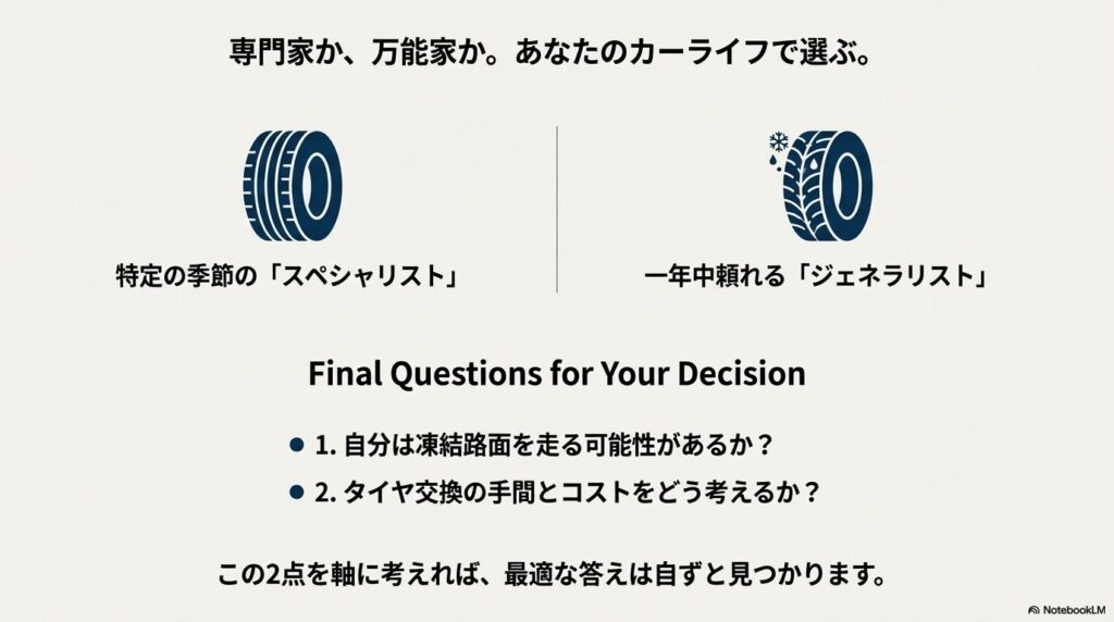 サマータイヤは「特定の季節のスペシャリスト」、オールシーズンタイヤは「一年中頼れるジェネラリスト」です。