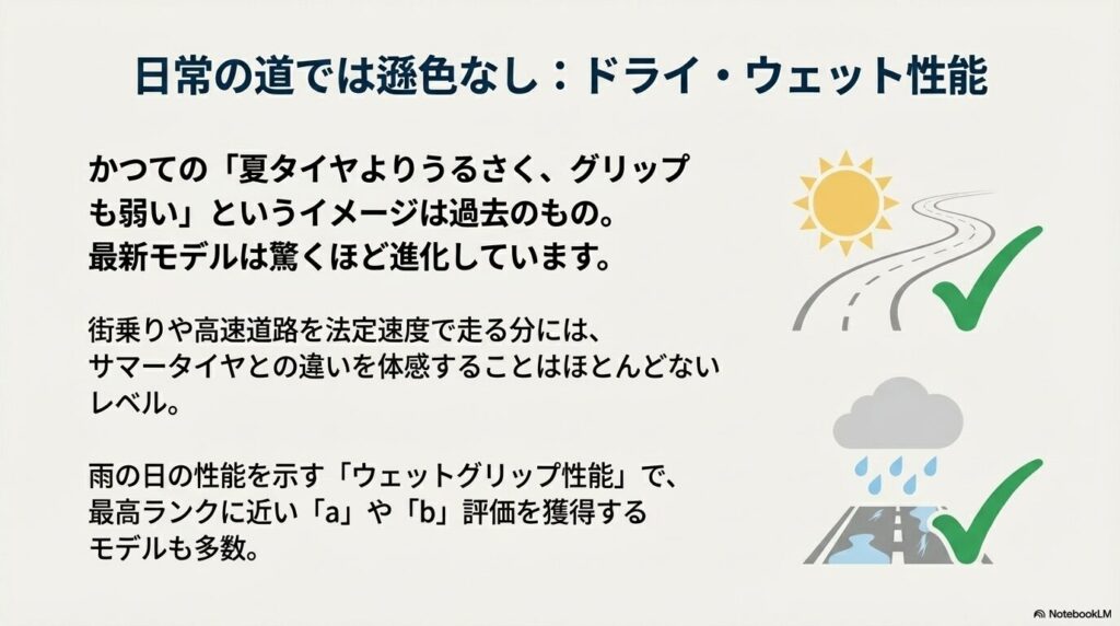 特に雨の日の性能を示す「ウェットグリップ性能」で、最高ランクに近い評価(ラベリング「a」や「b」)を獲得しているオールシーズンタイヤも多いんです。