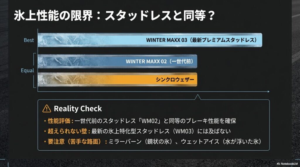 つまり、最新のプレミアムスタッドレス(WM03)と比べると、氷上性能には明確な差があるということです。