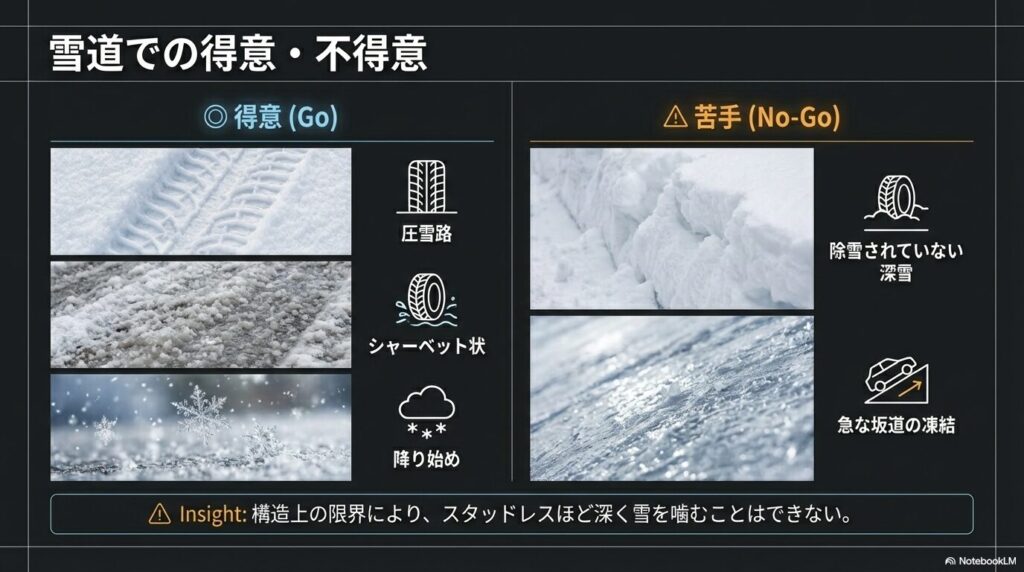 「魔法のタイヤ」とはいえ、すべての状況で完璧というわけではありません。