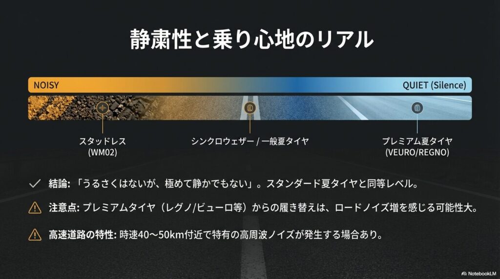 特に高級車(レクサスLBXなど)での試乗では「静粛性を損なわない」と評価されていますが、これは車の遮音性が高いことも関係していそうです。