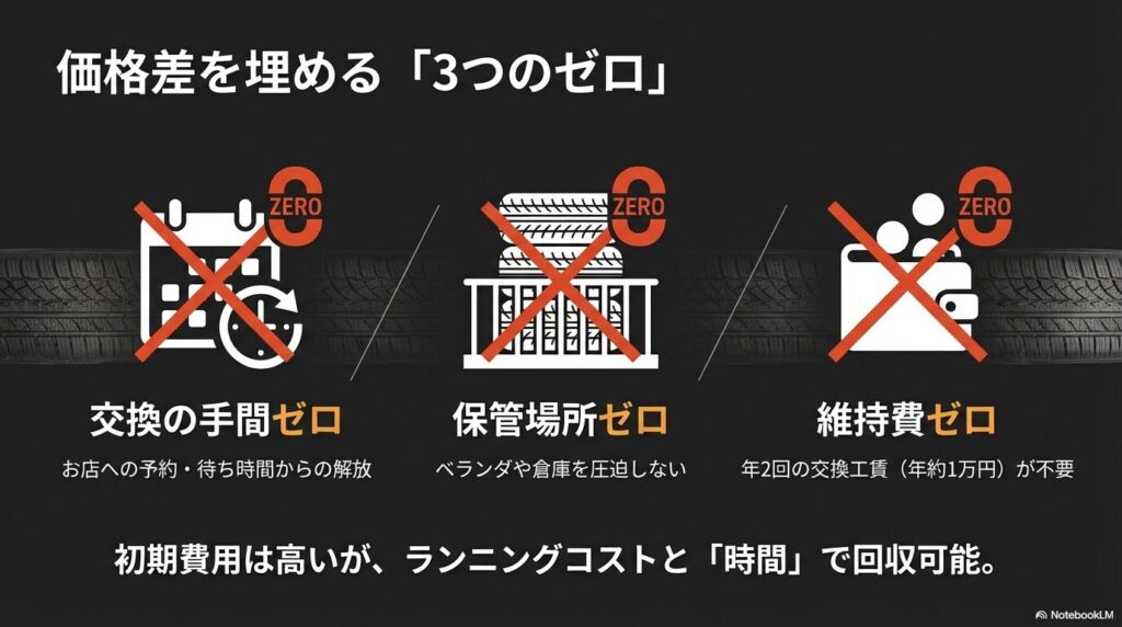 スタッドレスタイヤと夏タイヤの2セットを持つと、どうしても保管場所や毎回の交換費用がかかります。