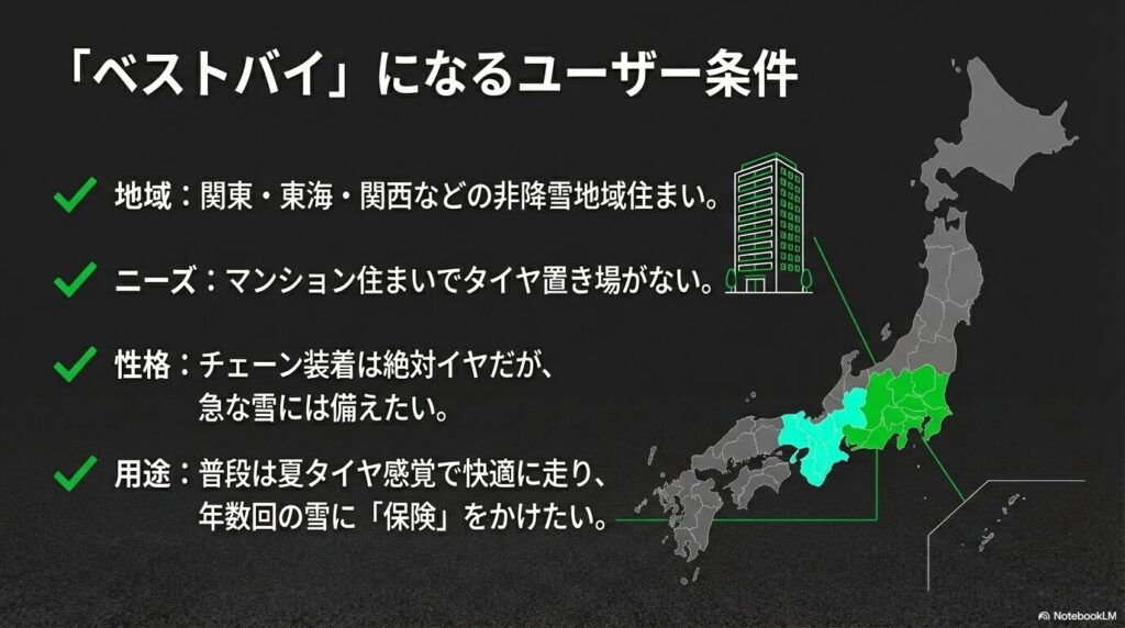 このタイヤが輝くのは、「関東や東海、関西などの非降雪地域に住んでいる人」です。