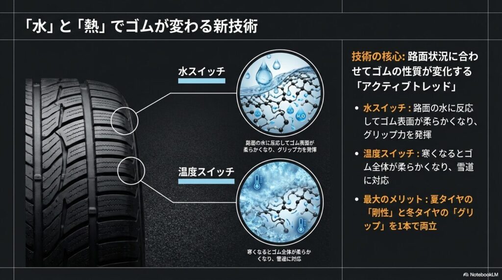「アクティブトレッド」という技術が、寒くなるとゴムを柔らかくしてくれるおかげですね。実際の走行シーン別に対応力を整理しました。