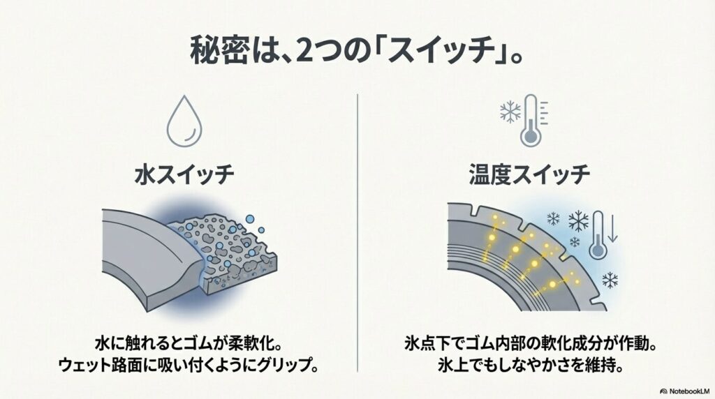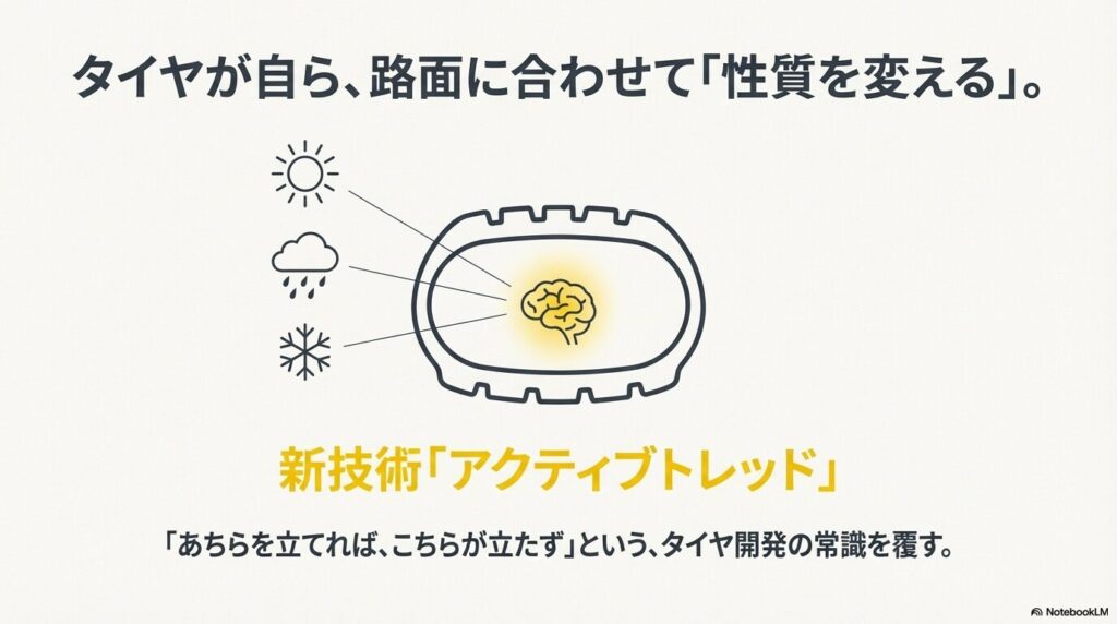 しかし、アクティブトレッドは「路面の状況に合わせて、ゴムが勝手に性質を変える」という、まるで生き物みたいな技術を使っているんです。