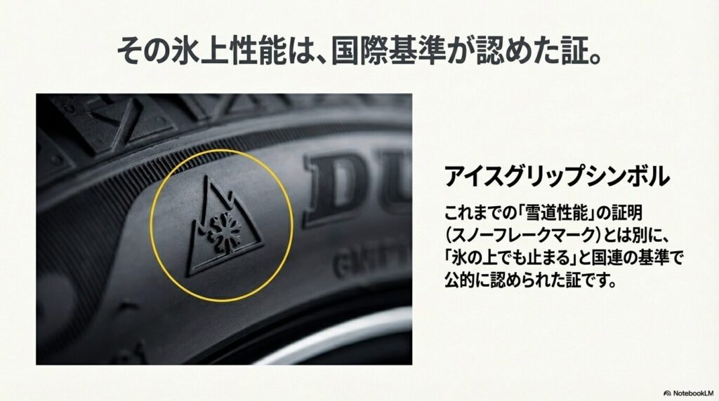 実際、このタイヤは国連の基準をクリアして「アイスグリップシンボル」を取得しています。